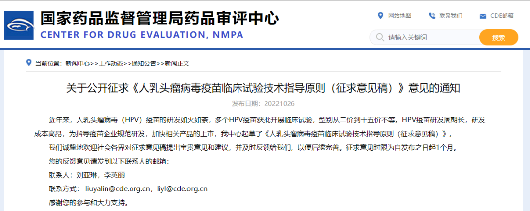 關于公開征求《人乳頭瘤病毒疫苗臨床試驗技術指導原則(征求意見稿)》意見的通知