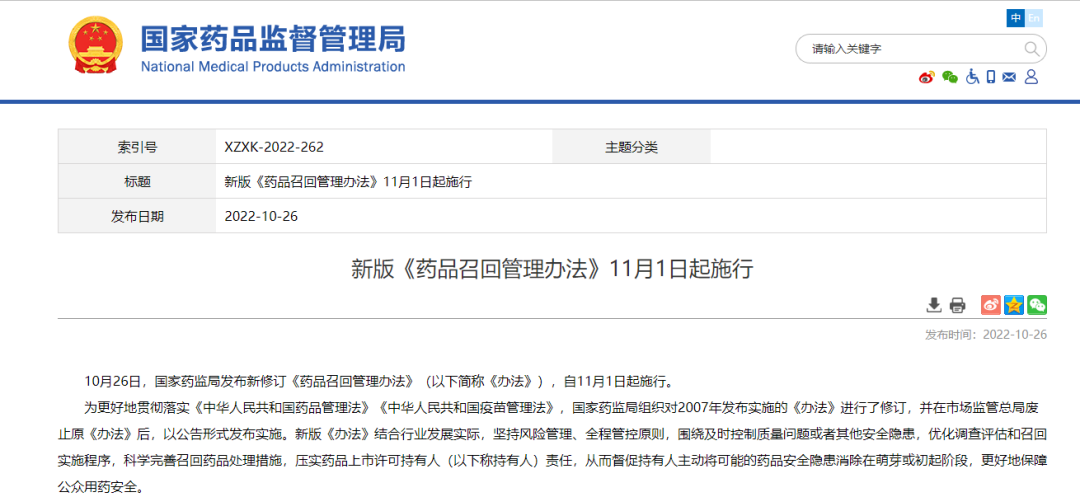 國家藥監局關于發布《藥品召回管理辦法》的公告(2022年第92號)