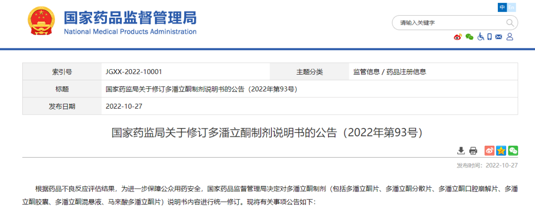 國家藥監局關于修訂多潘立酮制劑說明書的公告(2022年第93號)
