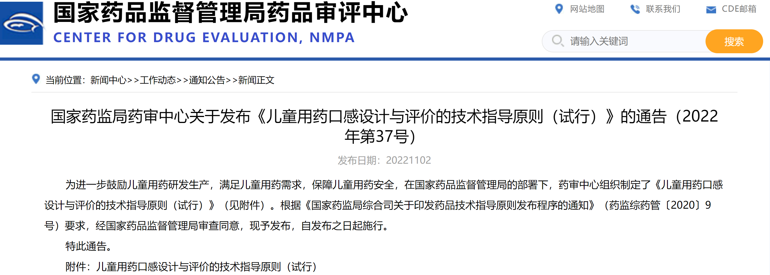 國家藥監局藥審中心關于發布《兒童用藥口感設計與評價的技術指導原則(試行)》的通告(2022年第37號)