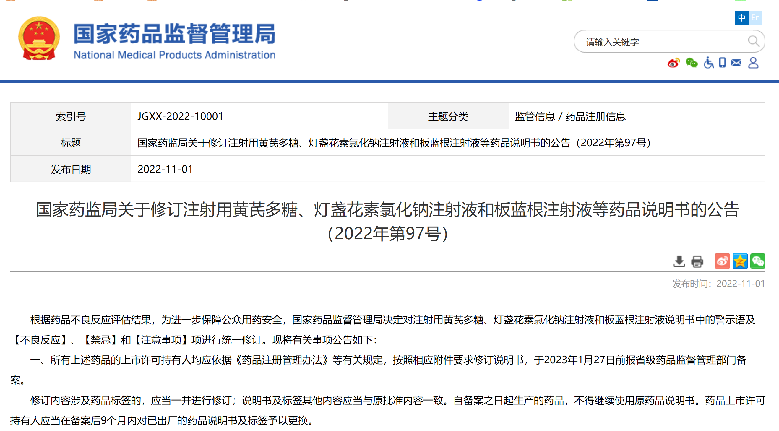 國家藥監局關于修訂注射用黃芪多糖、燈盞花素氯化鈉注射液和板藍根注射液等藥品說明書的公告(2022年第97號)