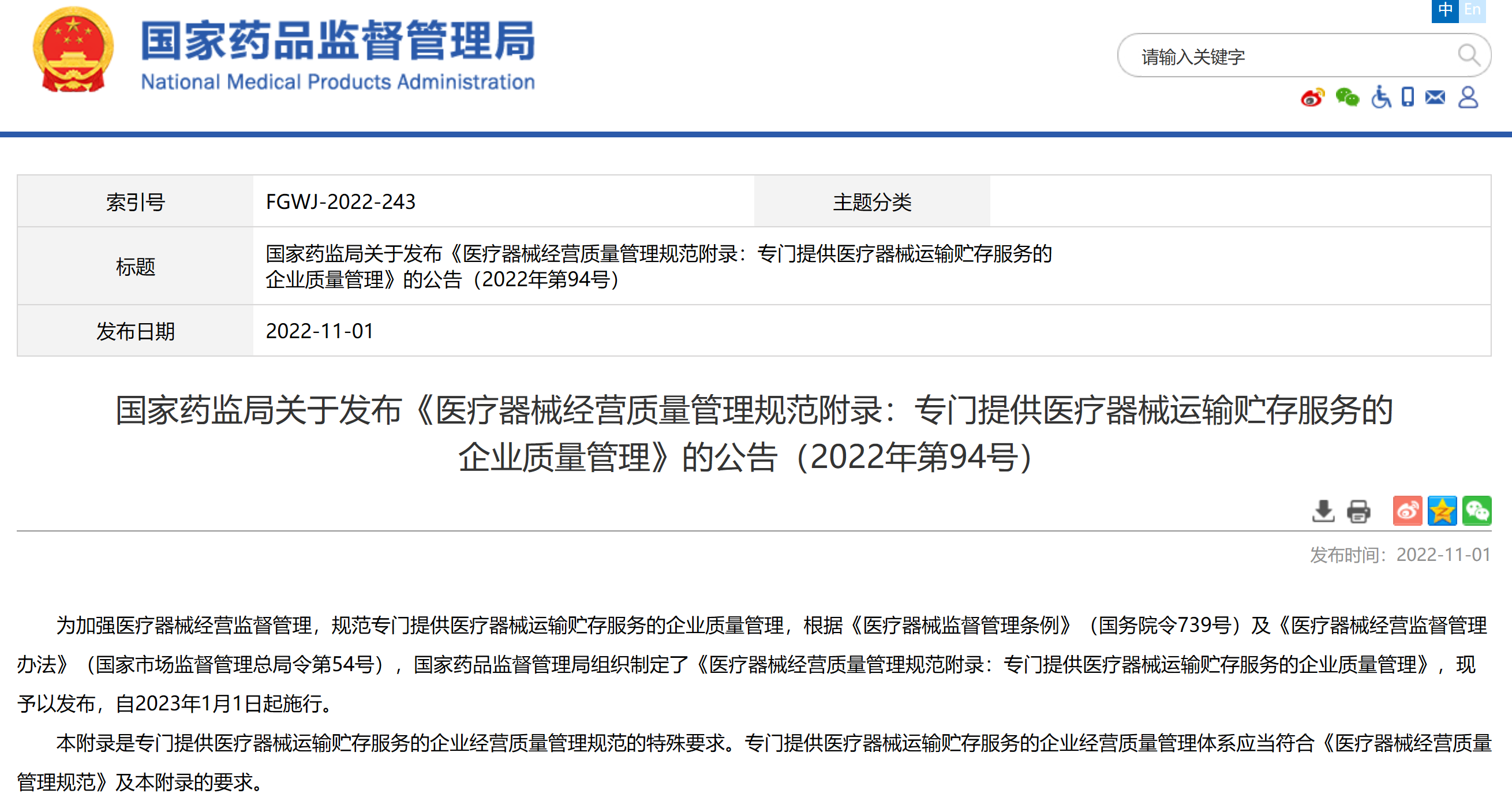 國家藥監局關于發布《醫療器械經營質量管理規范附錄:專門提供醫療器械運輸貯存服務的企業質量管理》的公告(2022年第94號)