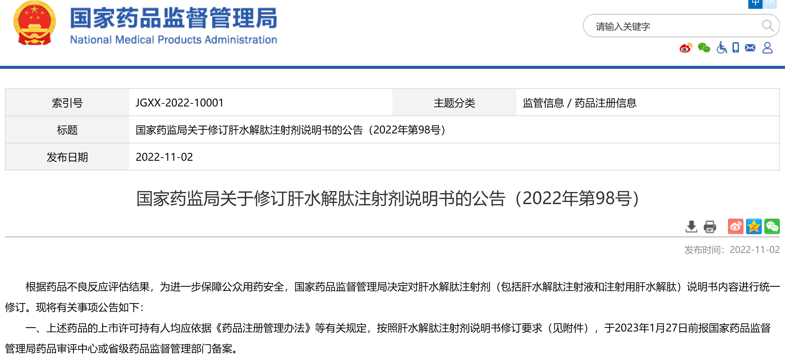國家藥監局關于修訂肝水解肽注射劑說明書的公告(2022年第98號)
