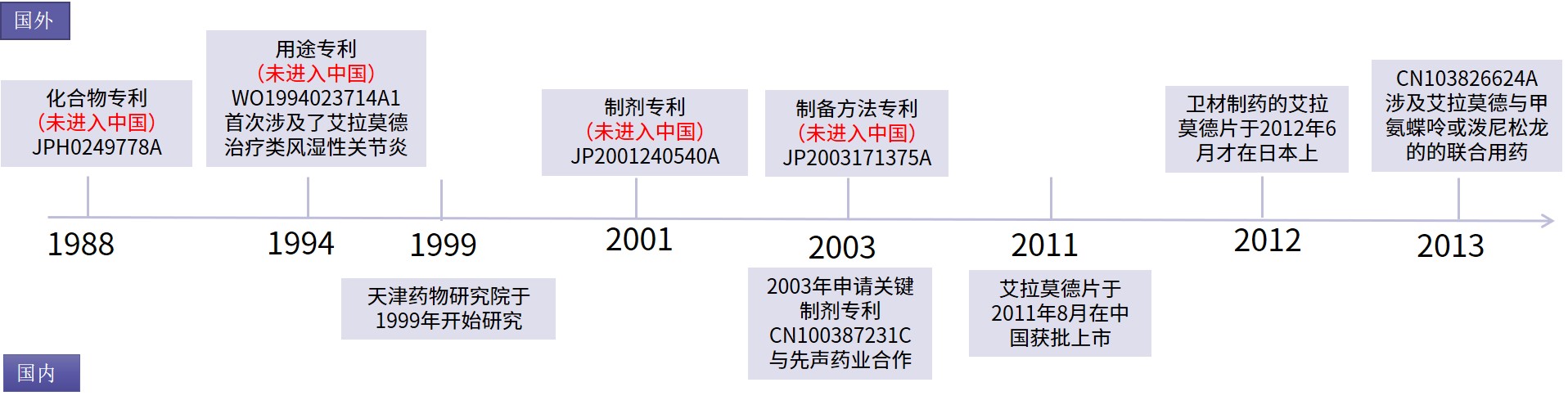 艾拉莫德(Iguratimod)臨床上用于治療類風(fēng)濕性關(guān)節(jié)炎。艾拉莫德化合物由日本富山化學(xué)于1988年申請了化合物專利JPH0249778A,后富山化學(xué)與衛(wèi)材藥業(yè)進(jìn)行合作開發(fā),明確了研發(fā)艾拉莫德的主要應(yīng)用方向為類風(fēng)濕性關(guān)節(jié)炎并進(jìn)行了臨床研究,于1994年申請的專利WO1994023714A1首次涉及了艾拉莫德治療類風(fēng)濕性關(guān)節(jié)炎,該專利在日本、歐洲、美國等國家或地區(qū)獲得授權(quán),但是卻沒有進(jìn)入中國。但艾拉莫德關(guān)鍵的化合物專利(JPH0249778A)及用途專利(WO1994023714A1)未進(jìn)入中國的專利布局失誤,為后來先聲藥業(yè)的艾拉莫德片率先上市而衛(wèi)材失去中國市場埋下了伏筆。隨著臨床的進(jìn)展,富山化學(xué)在2001-2003年又申請了涉及艾拉莫德片的制劑專利JP2001240540A及艾拉莫德制備方法的制備方法專利JP2003171375A,該2件專利同樣也未進(jìn)入中國。