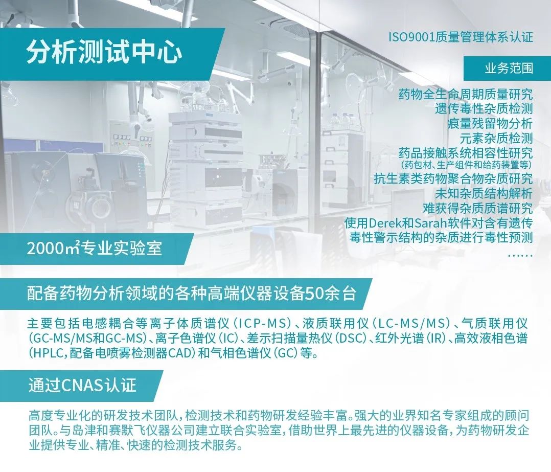分析測(cè)試中心自2014年起獨(dú)立開展藥品研發(fā)工作,積累了豐富的藥物質(zhì)量研究經(jīng)驗(yàn),主要提供痕量物質(zhì),如遺傳毒性雜質(zhì)、元素雜質(zhì)、殘留溶劑、聚合物雜質(zhì)、復(fù)雜制劑輔料剖析、藥品接觸系統(tǒng)相容性研究等符合NMPA、FDA、EMA等法規(guī)要求的研究檢測(cè)服務(wù)。