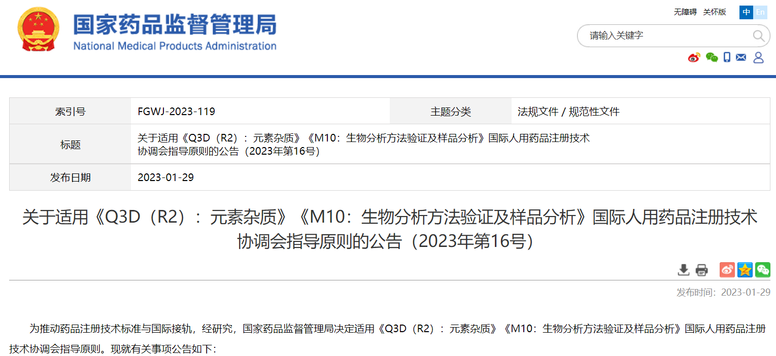關于適用《Q3D(R2):元素雜質》《M10:生物分析方法驗證及樣品分析》國際人用藥品注冊技術協調會指導原則的公告(2023年第16號)