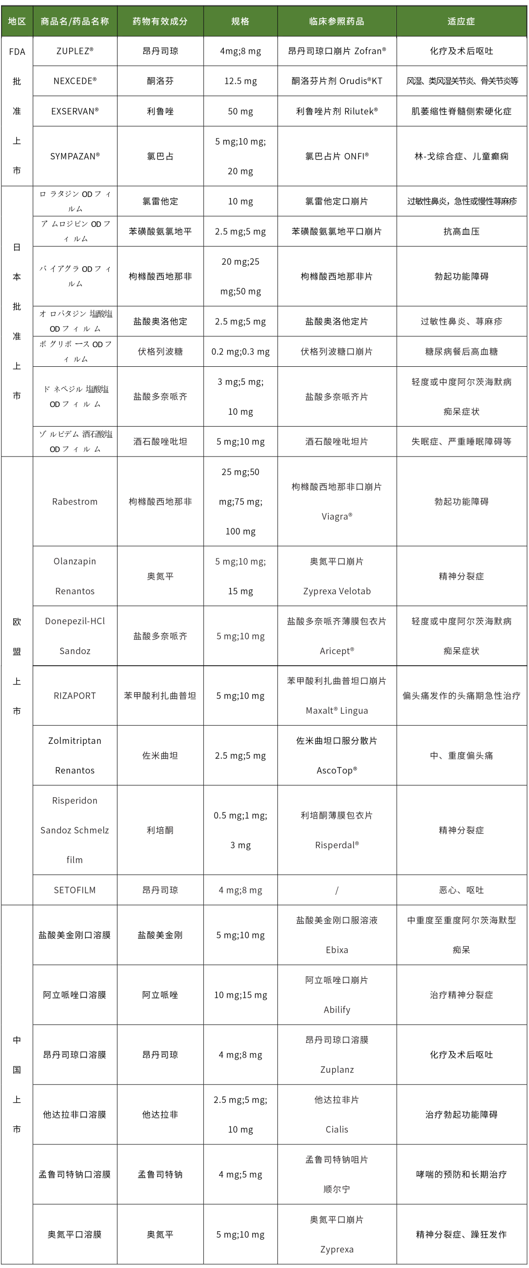 口溶膜作為一種新型口服藥物遞送劑型,具有可在口腔中迅速崩解,厚度薄,重量輕,耐折抗拉,攜帶方便,劑量準確等優點,可克服口腔崩解片易碎、抗折性差及口服液體制劑劑量控制差的缺點,有效的解決特殊患者如兒童、老人、精神病患者等服用藥物順應性差的問題,因此受到了廣泛關注,是制藥企業選擇改良創新藥物研究的熱點劑型。