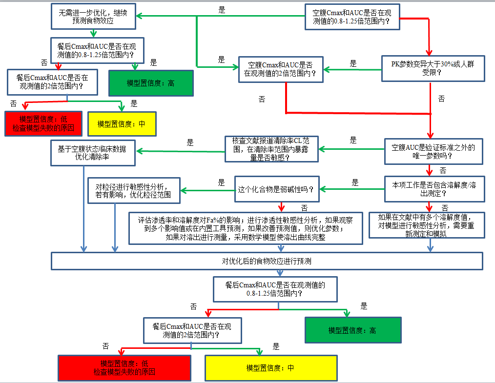 在Arian Emami Riedmaier等人撰寫(xiě)的文為評(píng)估PBPK模型食物效應(yīng)的預(yù)測(cè)能力,對(duì)30個(gè)化合物進(jìn)行模型建立,提出了模型驗(yàn)證和優(yōu)化的決策樹(shù):