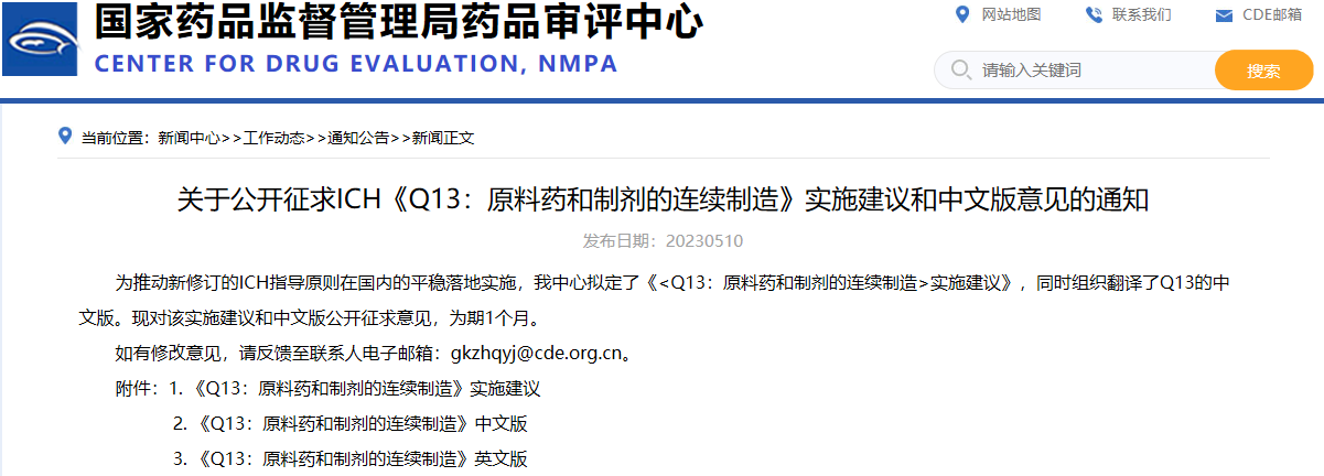 關于公開征求ICH《Q13:原料藥和制劑的連續制造》實施建議和中文版意見的通知