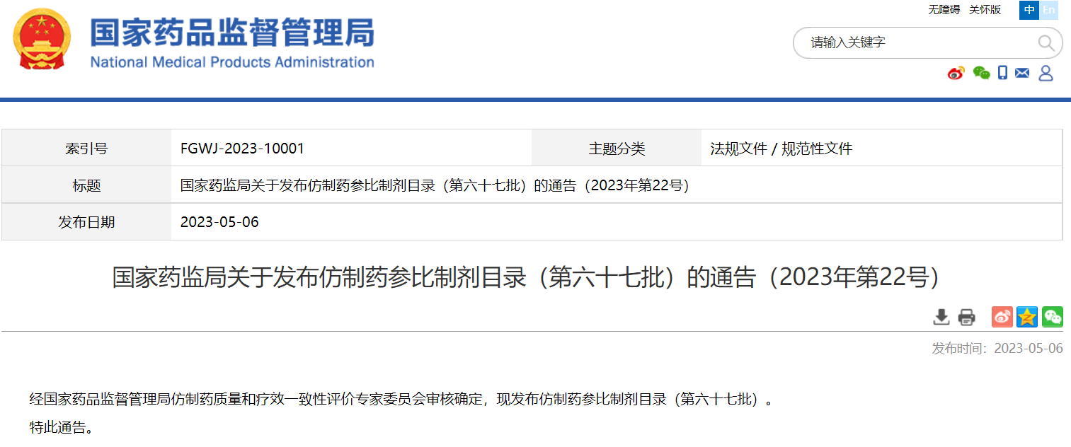 國家藥監局關于發布仿制藥參比制劑目錄(第六十七批)的通告(2023年第22號)