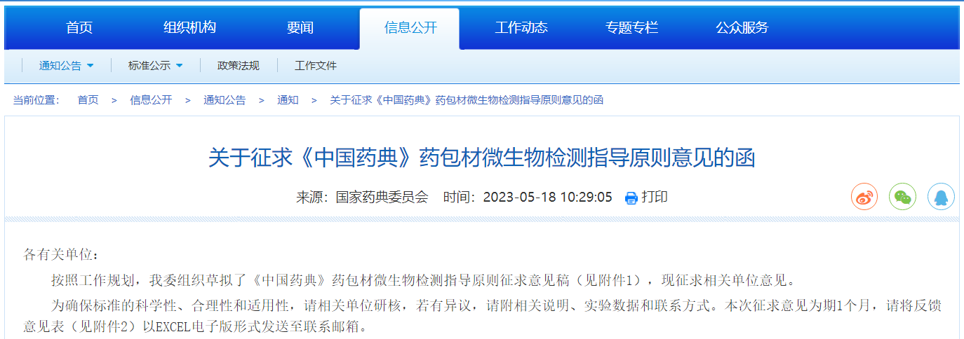 國家藥典委關于征求《中國藥典》藥包材微生物檢測指導原則意見的函 長按識別圖中二維碼 查看詳細信息