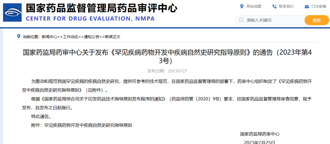 國家藥監(jiān)局藥審中心關于發(fā)布《罕見疾病藥物開發(fā)中疾病自然史研究指導原則》的通告(2023年第43號)