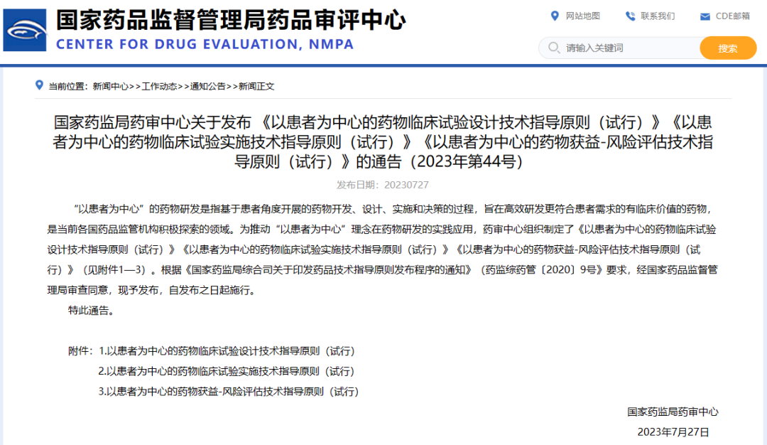 國家藥監(jiān)局藥審中心關于發(fā)布 《以患者為中心的藥物臨床試驗設計技術指導原則(試行)》《以患者為中心的藥物臨床試驗實施技術指導原則(試行)》《以患者為中心的藥物獲益-風險評估技術指導原則(試行)》的通告(2023年第44號)