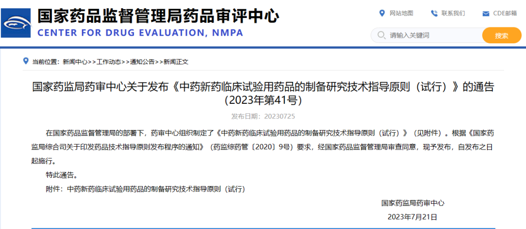 國家藥監(jiān)局藥審中心關于發(fā)布《中藥新藥臨床試驗用藥品的制備研究技術指導原則(試行)》的通告(2023年第41號)