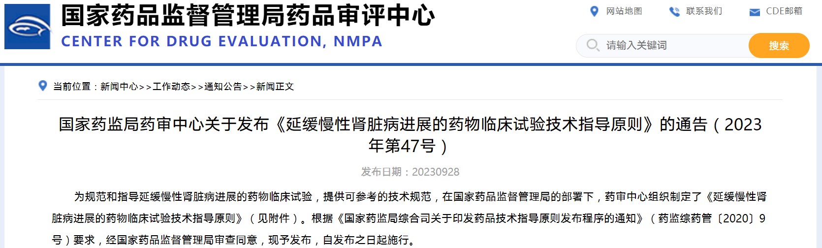 國家藥監(jiān)局藥審中心關(guān)于發(fā)布《延緩慢性腎臟病進(jìn)展的藥物臨床試驗(yàn)技術(shù)指導(dǎo)原則》的通告(2023年第47號)