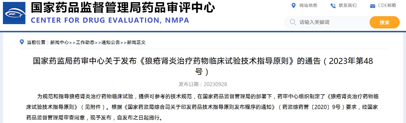 國家藥監(jiān)局藥審中心關(guān)于發(fā)布《狼瘡腎炎治療藥物臨床試驗(yàn)技術(shù)指導(dǎo)原則》的通告(2023年第48號)