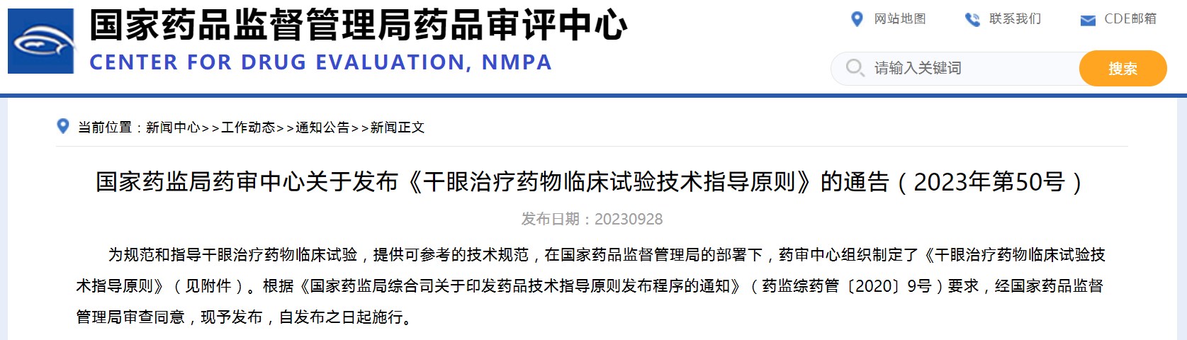 國家藥監(jiān)局藥審中心關(guān)于發(fā)布《干眼治療藥物臨床試驗(yàn)技術(shù)指導(dǎo)原則》的通告(2023年第50號)