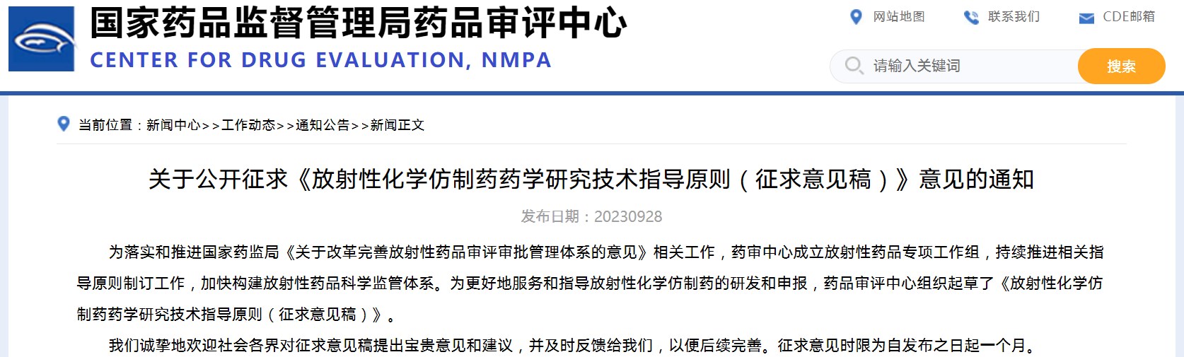 關(guān)于公開征求《放射性化學(xué)仿制藥藥學(xué)研究技術(shù)指導(dǎo)原則(征求意見稿)》意見的通知