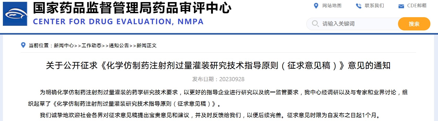 關(guān)于公開征求《化學(xué)仿制藥注射劑過量灌裝研究技術(shù)指導(dǎo)原則(征求意見稿)》意見的通知