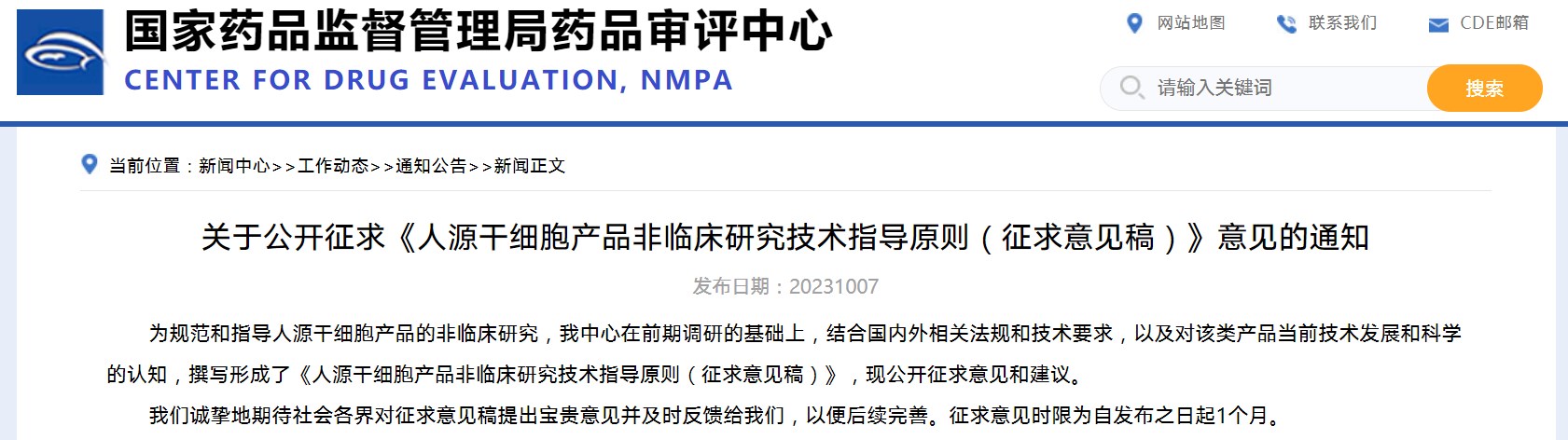 關(guān)于公開征求《人源干細(xì)胞產(chǎn)品非臨床研究技術(shù)指導(dǎo)原則(征求意見稿)》意見的通知
