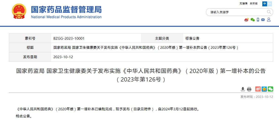 國家藥監(jiān)局 國家衛(wèi)生健康委關(guān)于發(fā)布實(shí)施《中華人民共和國藥典》(2020年版)第一增補(bǔ)本的公告(2023年第126號)