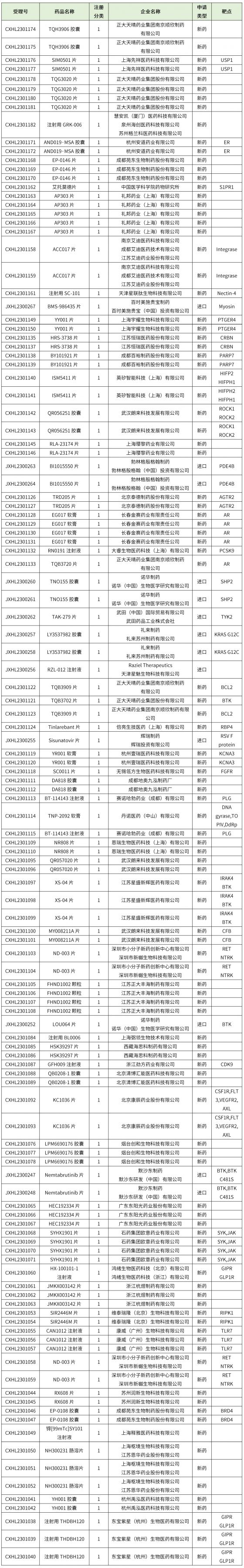 ① 化藥1類新藥61個(艾托莫德片、TQH3906膠囊、SIM0501片、TQG3020片、BMS-986435片、BI1015550片、TNO155膠囊、TAK-279片、LY3537982膠囊、Sisunatovir片、LOU064片、Nemtabrutinib片等),藥物詳細信息見下表。