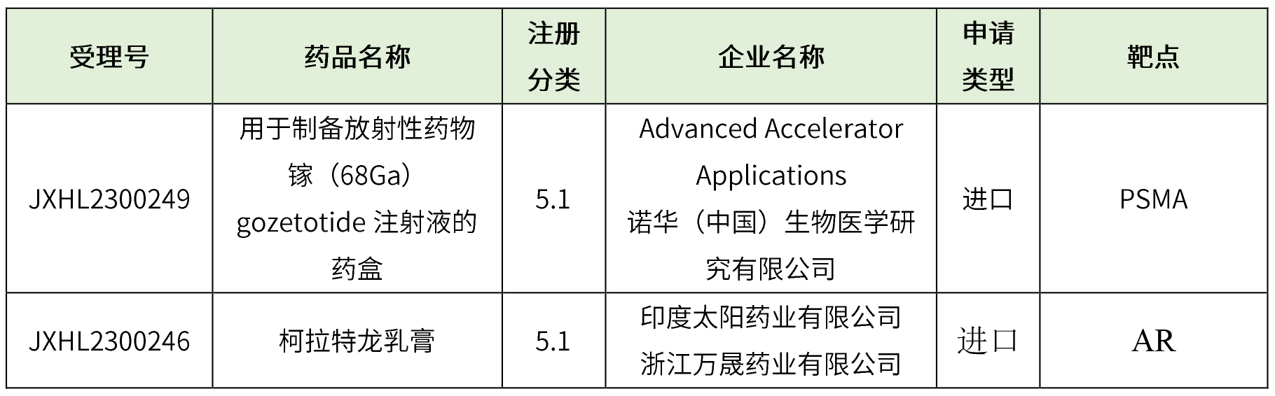 ③ 化藥5.1類進口2個(用于制備放射性藥物鎵(68Ga)gozetotide注射液的藥盒、柯拉特龍乳膏),藥物詳細信息見下表。