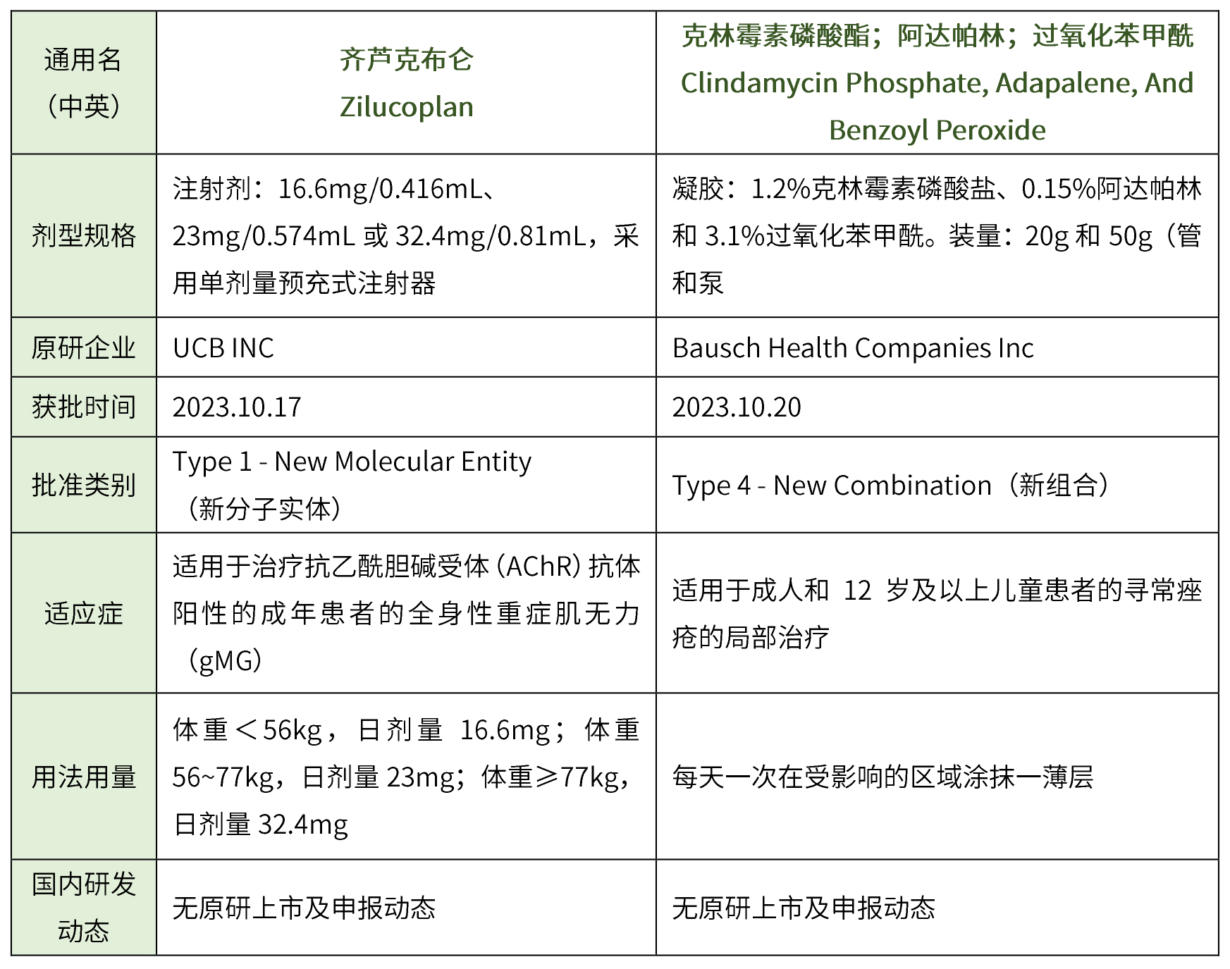 共計5個,其中化藥3個(吉法匹生片、艾拉司群片、克立他酶注射液,生物藥2個(替雷利珠單抗注射液、艾可瑞妥單抗注射用濃溶液),藥物詳細信息見下表。