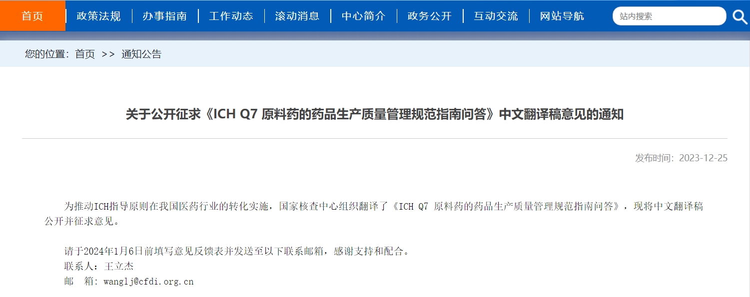 關于公開征求《ICH Q7 原料藥的藥品生產質量管理規范指南問答》中文翻譯稿意見的通知