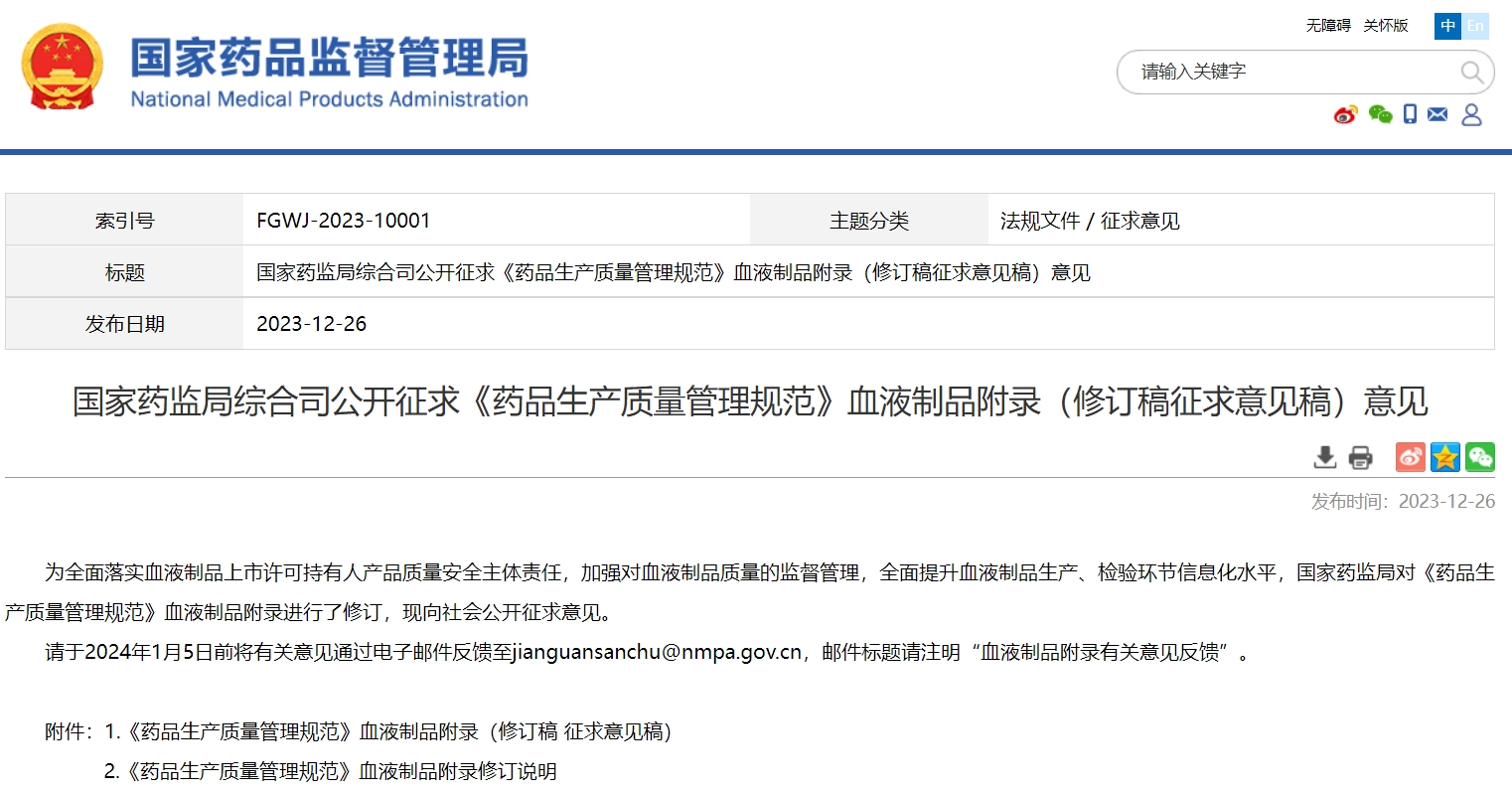 國家藥監局綜合司公開征求《藥品生產質量管理規范》血液制品附錄(修訂稿征求意見稿)意見