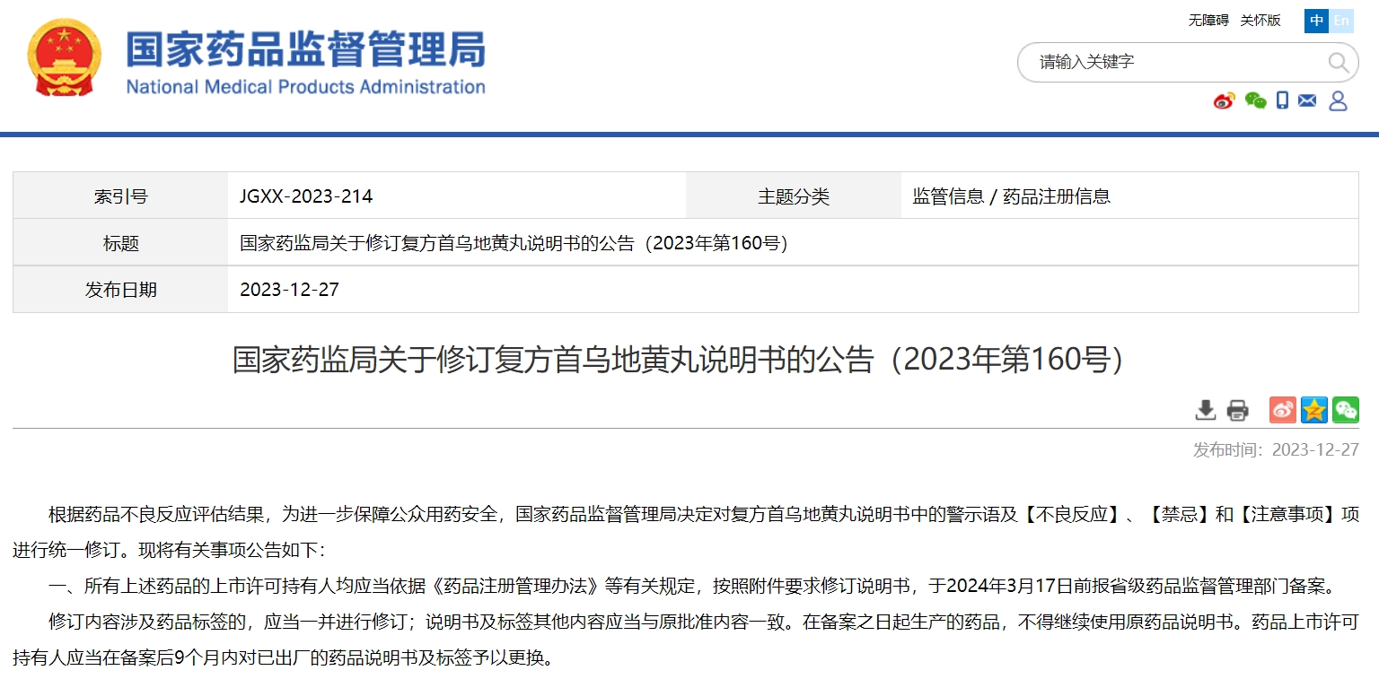 國家藥監局關于修訂復方首烏地黃丸說明書的公告(2023年第160號)