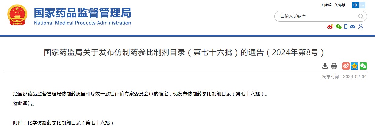 國家藥監(jiān)局關于發(fā)布仿制藥參比制劑目錄(第七十六批)的通告(2024年第8號)