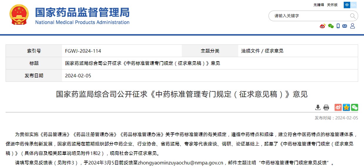 國家藥監(jiān)局綜合司公開征求《中藥標準管理專門規(guī)定(征求意見稿)》意見