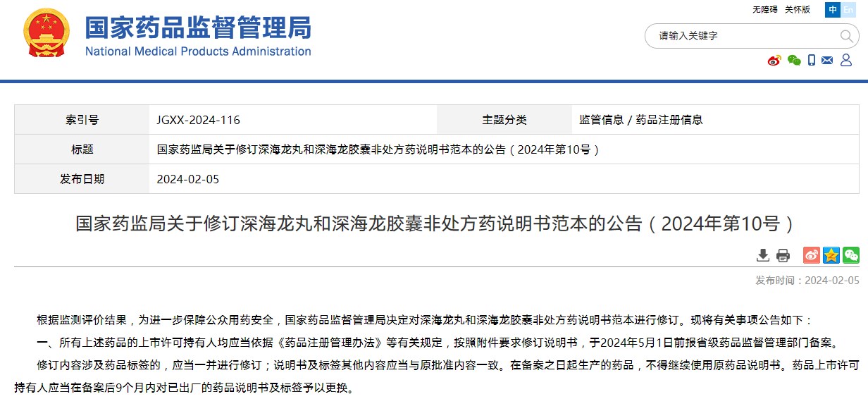 國家藥監(jiān)局關于修訂深海龍丸和深海龍膠囊非處方藥說明書范本的公告(2024年第10號)