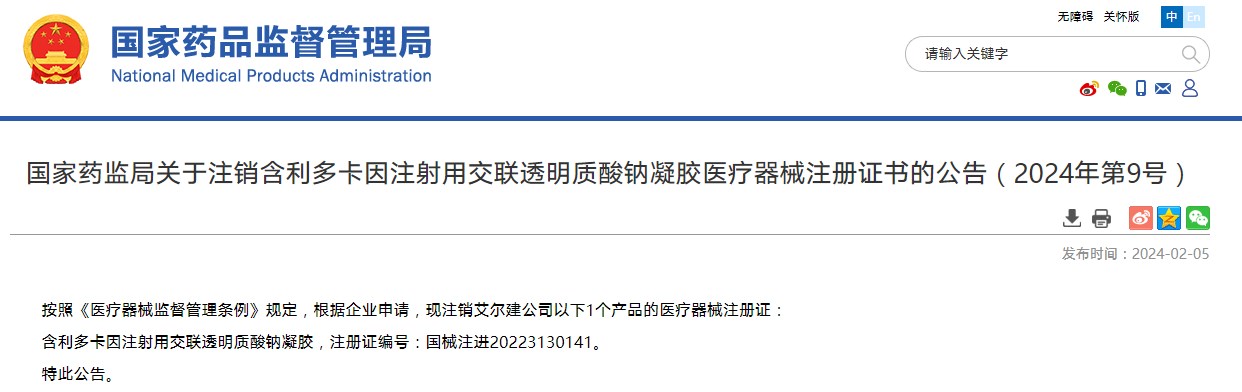 國家藥監(jiān)局關于注銷含利多卡因注射用交聯(lián)透明質酸鈉凝膠醫(yī)療器械注冊證書的公告(2024年第9號)