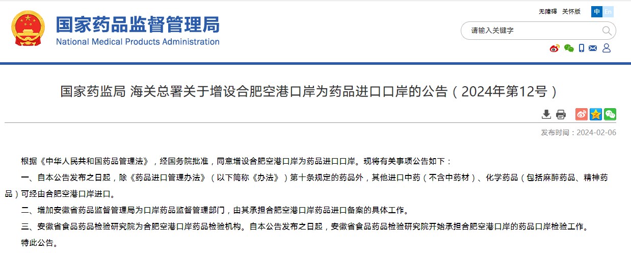 國家藥監(jiān)局 海關總署關于增設合肥空港口岸為藥品進口口岸的公告(2024年第12號)