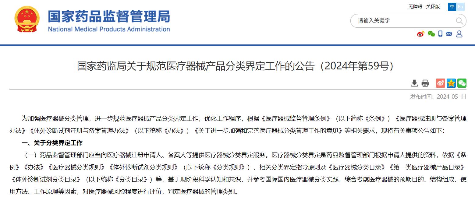 國家藥監(jiān)局關于規(guī)范醫(yī)療器械產(chǎn)品分類界定工作的公告(2024年第59號)