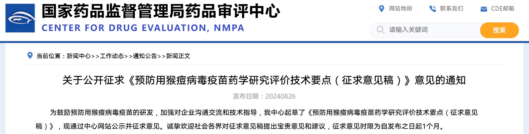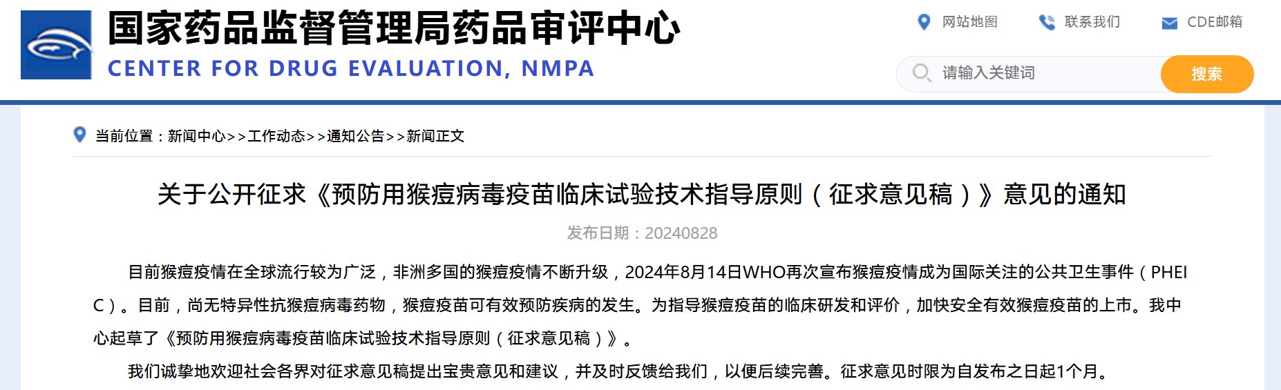 關于公開征求《預防用猴痘病毒疫苗藥學研究評價技術要點(征求意見稿)》意見的通知