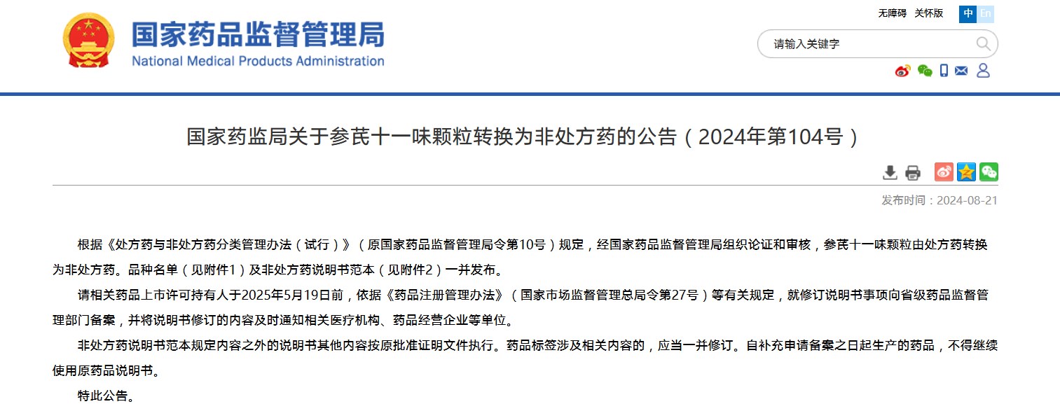 國家藥監局關于參芪十一味顆粒轉換為非處方藥的公告(2024年第104號)