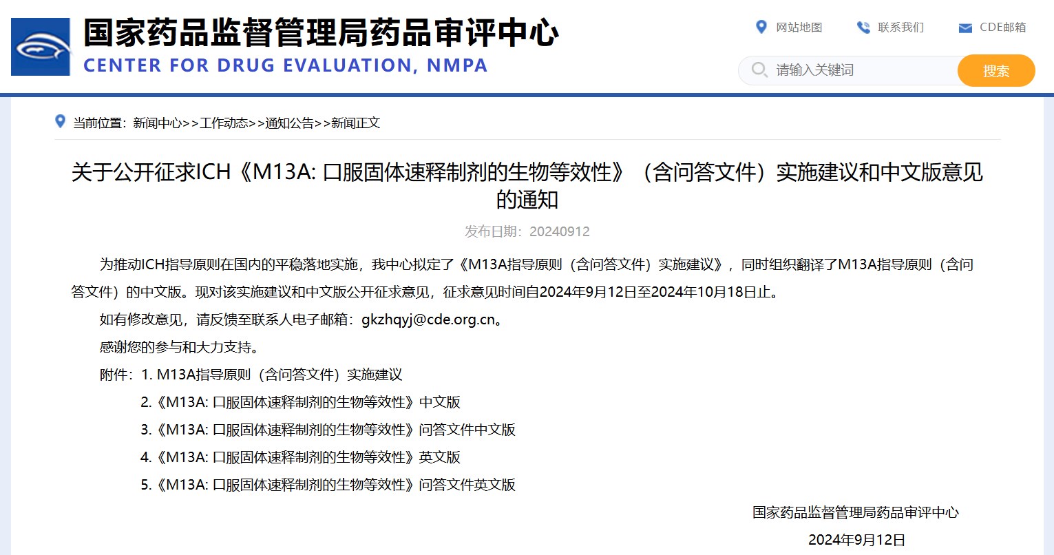 關(guān)于公開征求ICH《M13A: 口服固體速釋制劑的生物等效性》(含問答文件)實施建議和中文版意見的通知