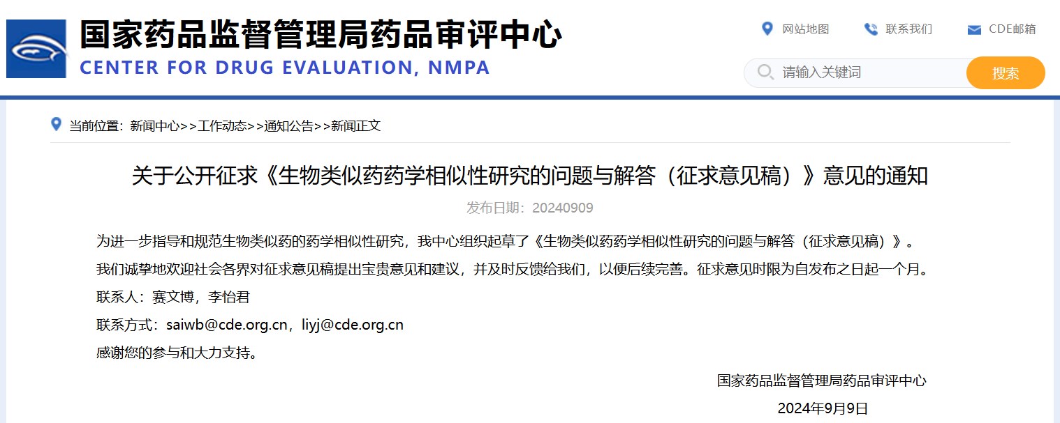 關(guān)于公開征求《生物類似藥藥學(xué)相似性研究的問題與解答(征求意見稿)》意見的通知