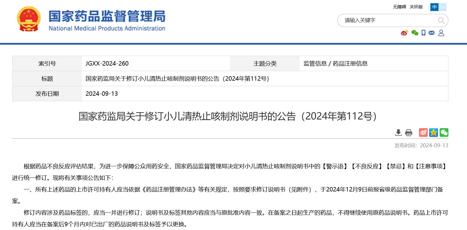 國家藥監(jiān)局關(guān)于修訂小兒清熱止咳制劑說明書的公告