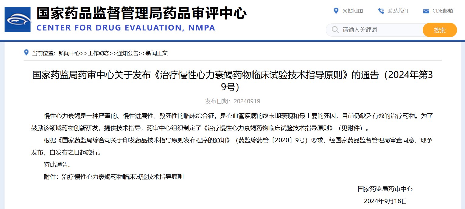 發(fā)布《治療慢性心力衰竭藥物臨床試驗技術(shù)指導(dǎo)原則》的通告