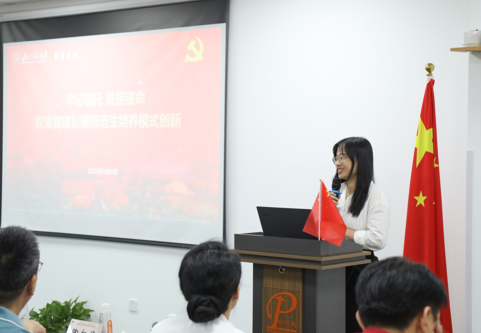 From BNU: Yang Zhao (Secretary of the Party Committee of the School of Chemistry), Han Juan (Deputy Secretary of the Party Committee), Ma Qiong (Deputy Secretary of the Party Committee), Professor Zhang Junbo, Professor Na Na, Associate Professor Zhao Changgui (from the School of Chemistry); Lu Zhonglin (Professor, Secretary of the Party Committee of Leyu Academy), Cao Meixin (Secretary of the Joint Party Branch of Teachers and Students of Mingde Dormitory), Zhang Yidan (Deputy Director of Mingde Dormitory) (from Leyu Academy);